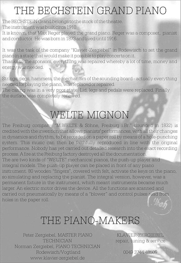 THE BECHSTEIN GRAND PIANOThe BECHSTEIN Grand belongs to the stock of the theatre. It was the task of the company “Klavier-Zergiebel” in Rodewisch to set the grand piano in a state that would make it possible to play concerts on it. Strings, pegs, hammers, the mechanism of the sounding board - actually everything needed for playing the piano, was replaced or repaired.